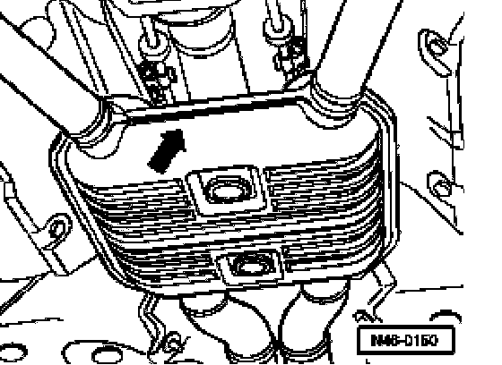 ^ Unscrew retaining nuts (arrows) from heat shield and remove.