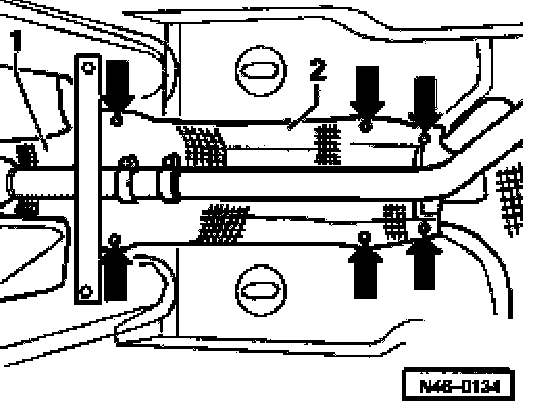 ^ Remove retaining nuts -arrows- from heat shield -2- and slide heat shield forward.