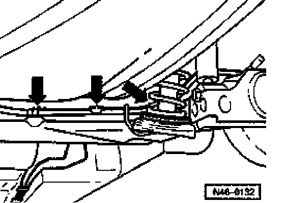 ^ Remove parking brake cables from retainers on rear axle (arrows).