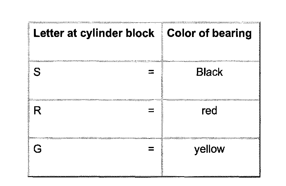 The letters marked on the lower sealing surface of the cylinder block identify which bearing thickness must to be installed in which location.