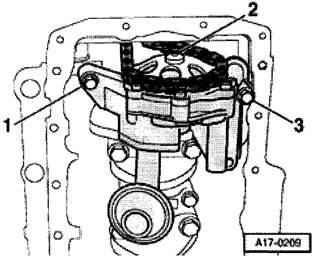 - Remove bolts -1- and -3- and remove oil pump.