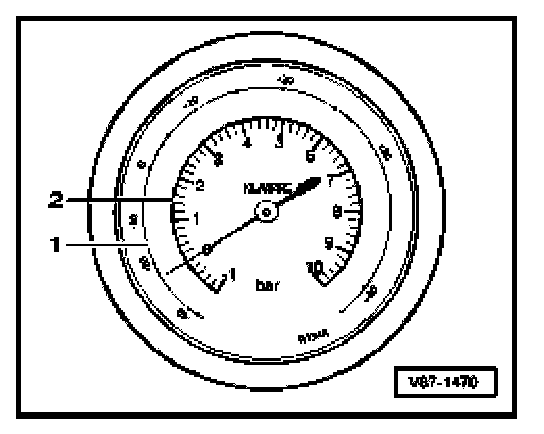 - High pressure gauge measures pressure and temperature, which expand uniformly from outlet of A/C compressor via the condenser up to constriction (restrictor, or expansion valve) with A/C system switched on.