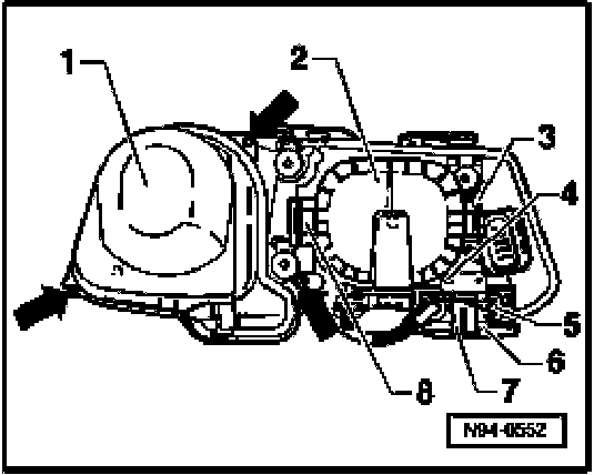 - After removal and installation of adjusting motor, headlight basic setting must always be reestablished VAS 5051 Vehicle Diagnostic Testing and Information System (the headlight inclination specification is embossed into the headlight housing).