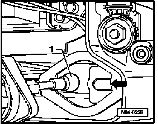 - Insert positioner linkage ball -1- into guide socket -arrow- in headlight housing by lifting reflector base plate slightly.