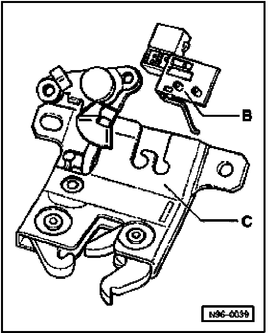 - Release luggage compartment light switch -B- from locating tabs and pull upwards from rear lid lock - C -.