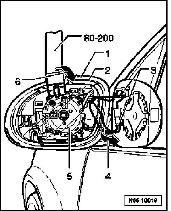 - Press off mirror glass - 2 - using Pry lever 80-200 from bracket - 5 - and housing -1 - - arrow 6 -.