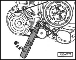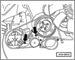 - Loosen bolts of the air conditioning compressor ribbed belt tensioner and take off ribbed belt.
