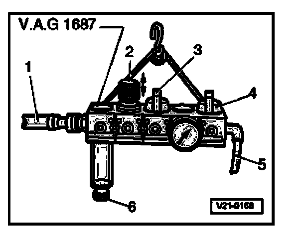 - Connect the compressed air line -1- (pressurized air supply) to Testing Unit for Turbo Charger V.A.G 1687.