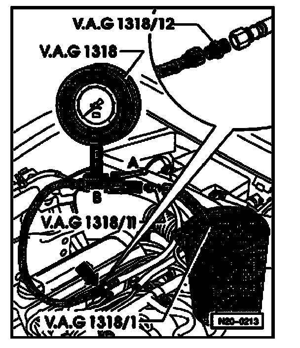 NOTE: This test also checks the connections of the fuel supply line from fuel delivery unit to connection point of Pressure Gauge V.A.G 1318 for proper seal.