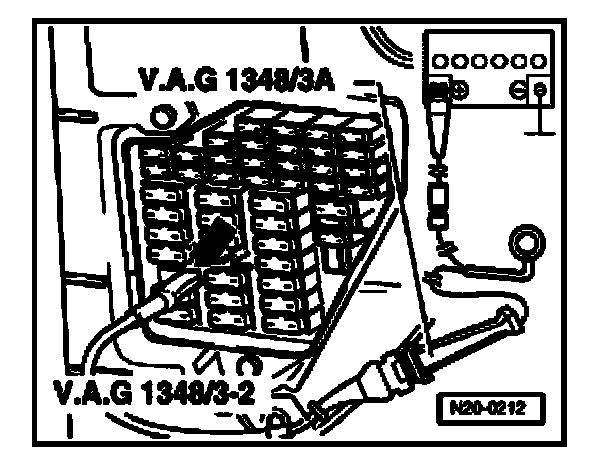 - Connect Remote Control V.A.G 1348/3A with Adapter Cable V.A.G 1348/32 to contact 28a to fuel pump and battery positive (+).