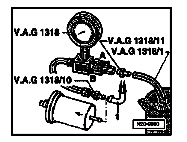 - Pressure Gauge V.A.G 1318 connected to fuel supply line of fuel supply tube