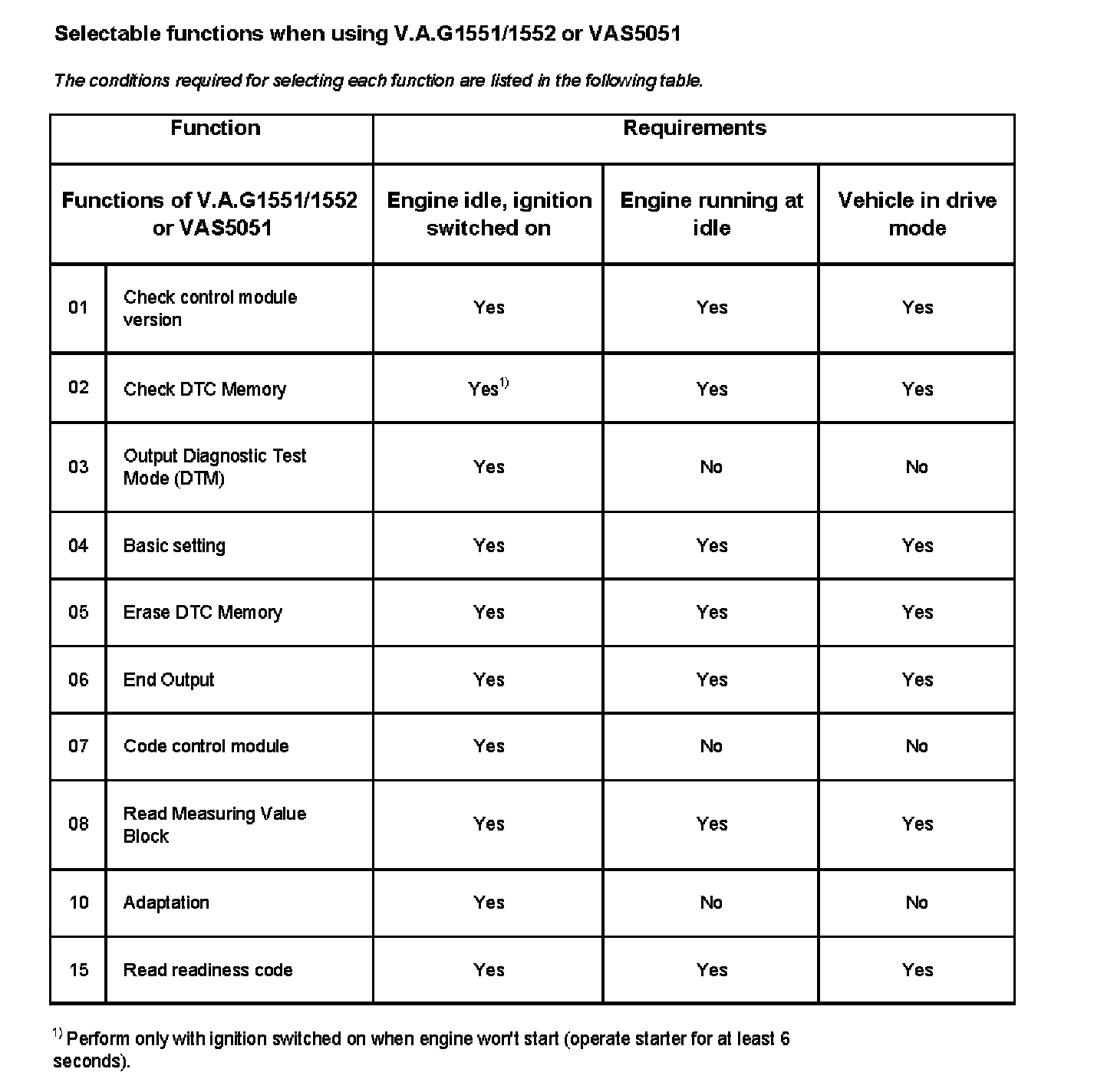 Selectable Functions When Using VAG1551/1552 or VAS5051