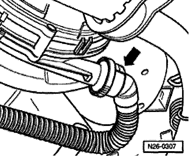 - Disconnect pressure hose (arrow) at Secondary Air Injection (AIR) pump motor and blow air in with light pressure. Combination valve must close.
