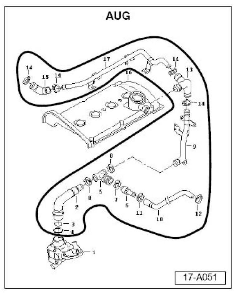 ^ Replace crankcase ventilation system hoses, pipes and pressure regulating valve depending on engine code (see circled items and compare to latest Parts Dept. illustration.