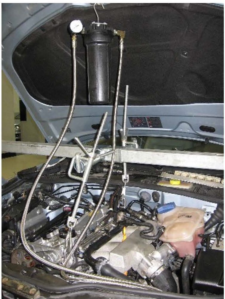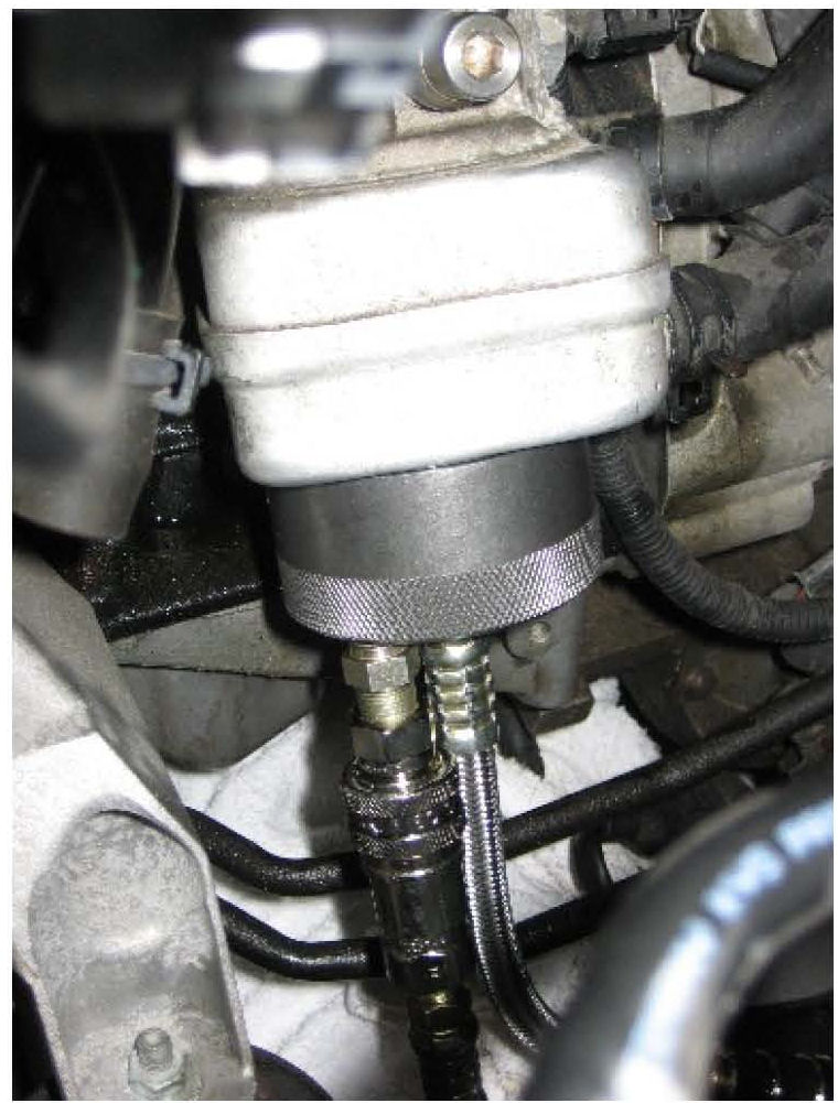 ^ Start engine and verify on the pressure gauge of the external oil filter assembly that appropriate engine oil pressure is obtained (see ElsaWeb Repair Manual for specifications).