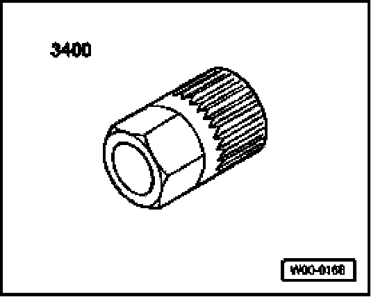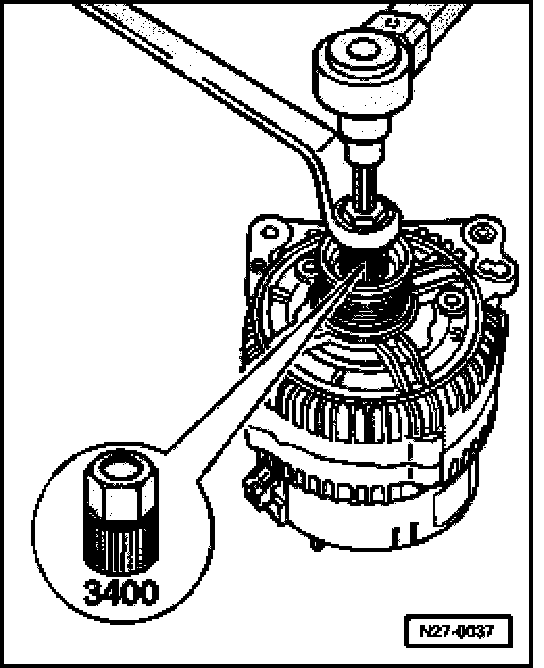 - Tighten nut at pulley with wrench and adapter 3400 while counter-holding generator drive with socket 3410 as illustrated.