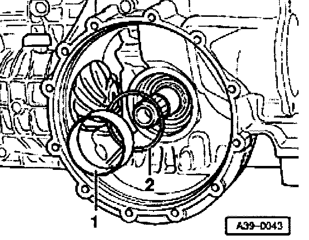 - Insert shim -2- and tapered roller bearing outer race -1- for differential onto stop in transmission housing by hand.