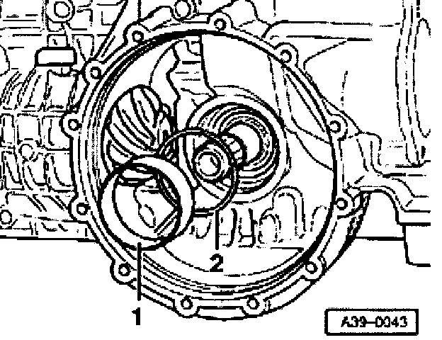 - Remove tapered roller bearing outer race -1- for differential and shim -2- (behind outer race) from transmission housing by hand.