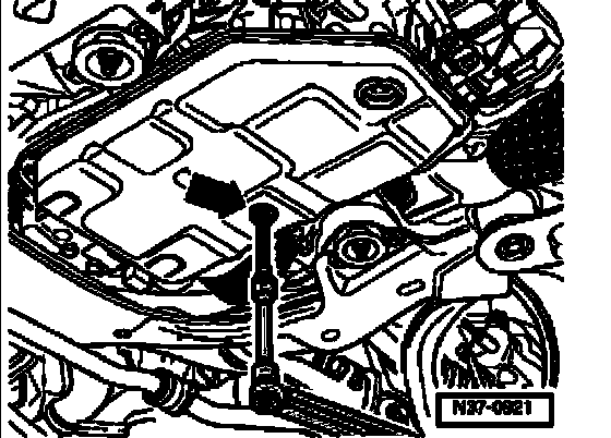^ Unscrew bolts on oil pan in diagonal sequence and remove oil pan.