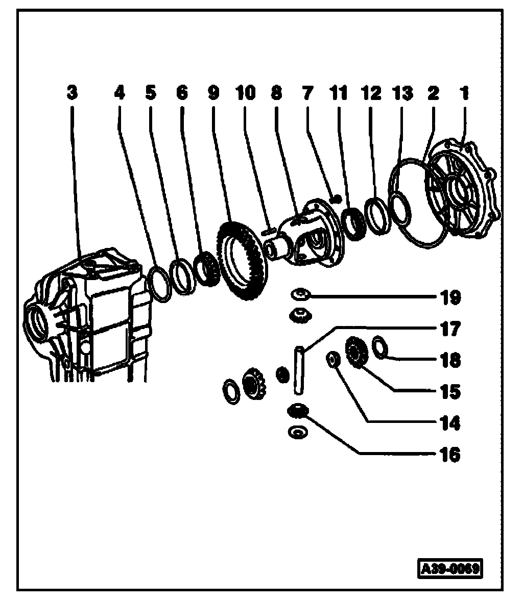 ^ Install small differential bevel gears offset by 180° together with thrust washers.