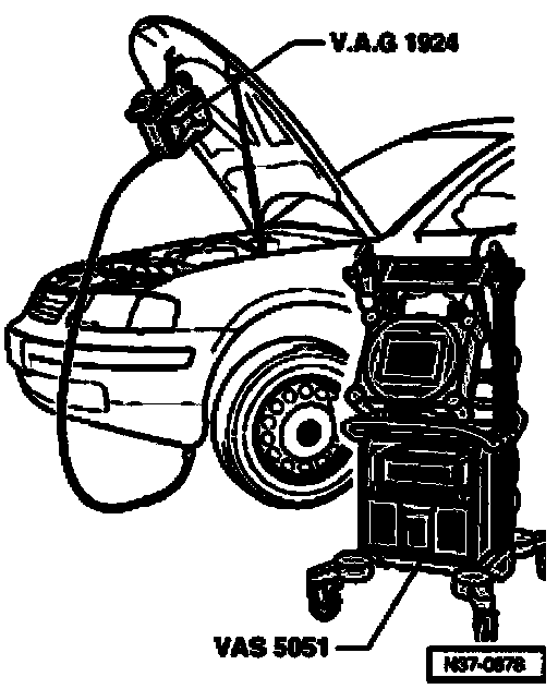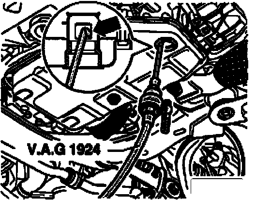 - Guide VAG 1924 in through an opening -arrow- in the deflector cap, taking care not to push the deflector cap upward out of position.