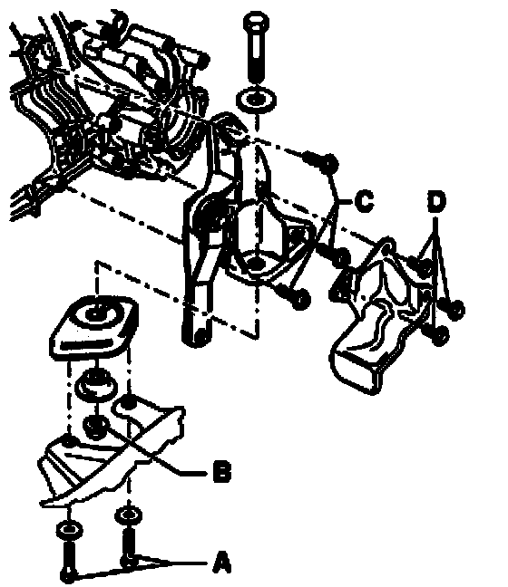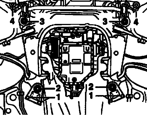 - Install right bonded rubber mount/protective plate -1- to transmission support.