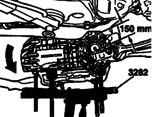 - Move jack VAG 1383 A with transmission mount 3282 under the transmission and support transmission.