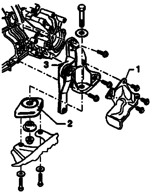 - Install right transmission support -3- with bonded rubber mount -2-.