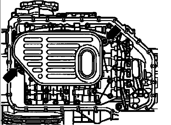 ^ Remove two bolts - arrows - of ATF filter.