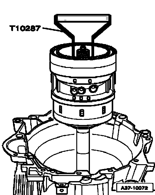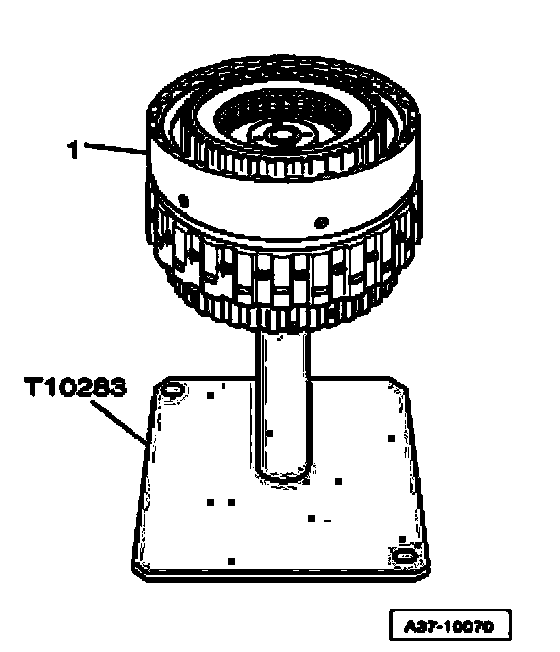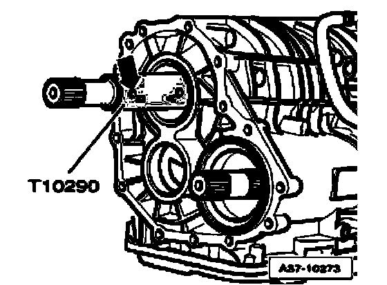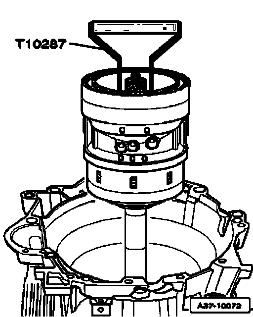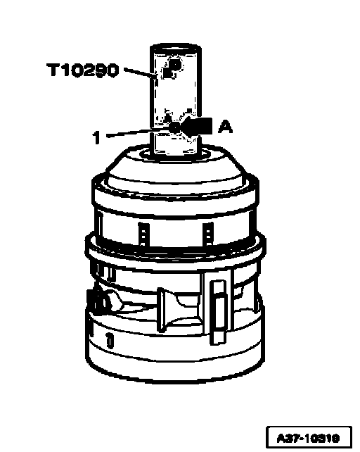 ^ Secure sun gear on input shaft without play, using assembly sleeve T10290, as depicted in illustration, thread stud screw - 1 - into bore identified by "A" - arrow A - and hand-tighten.