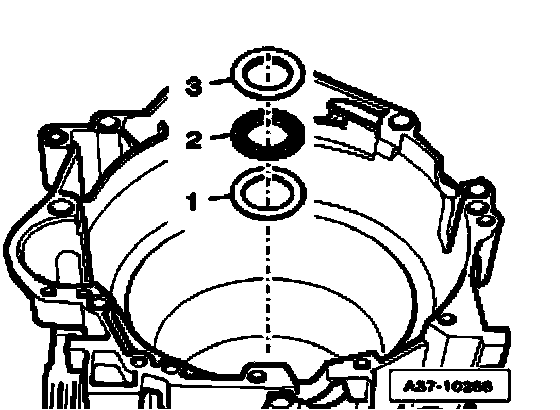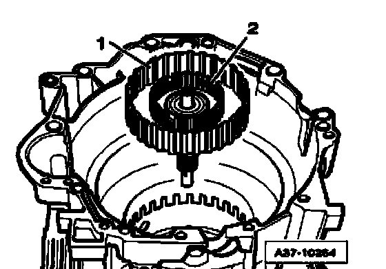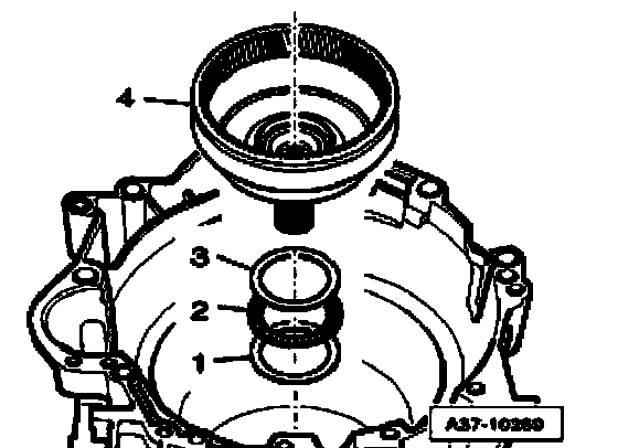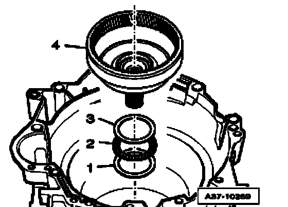 ^ Remove sun gear - 1 - with lower angle washer - 2 -, axial needle bearing - 3 - and upper angle washer - 4 - out of transmission housing.