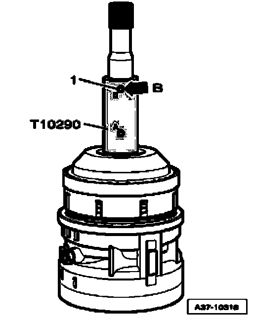 ^ Secure sun gear on input shaft without play, using assembly sleeve T10290, as depicted in illustration, thread stud screw - 1 - into bore identified by "B" - arrow B - and hand-tighten.