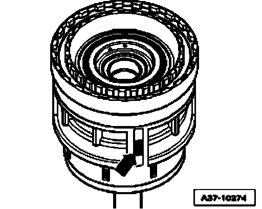 ^ Carefully insert circlip - arrow - for tower "I" into transmission housing.