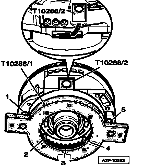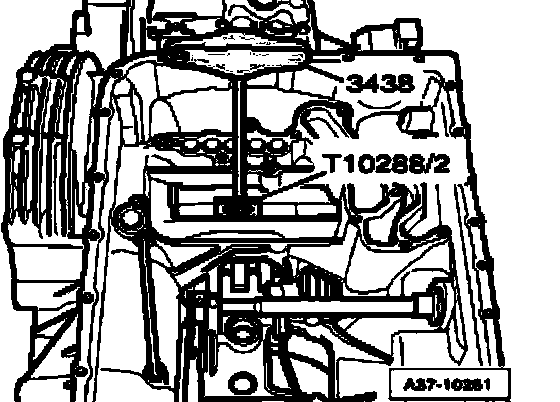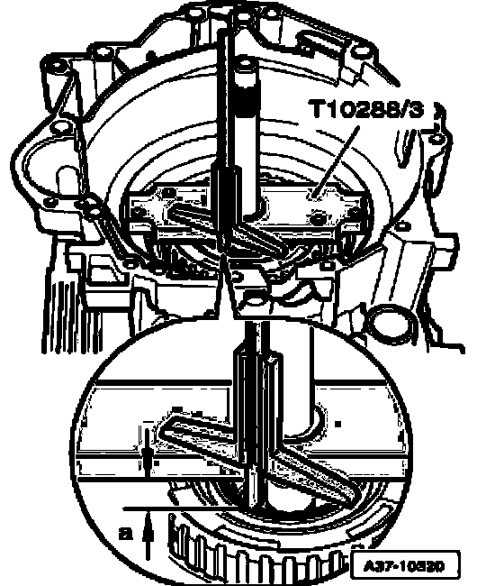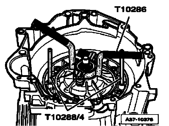 ^ Carefully remove centering tool T10288/3 upward, guide pins T10288/4 remain in transmission housing.