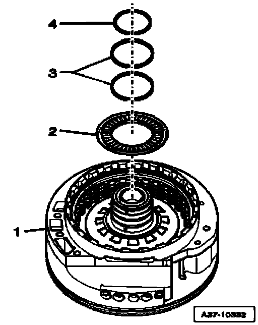 ^ Align coated plate - 3 - of clutch "C" using centering tool T10288/1, to do so let pins - 2 - and - 4 - engage in splines of all coated plate.