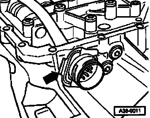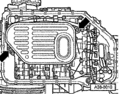 ^ Install ATF oil pan - arrow - with new seal.