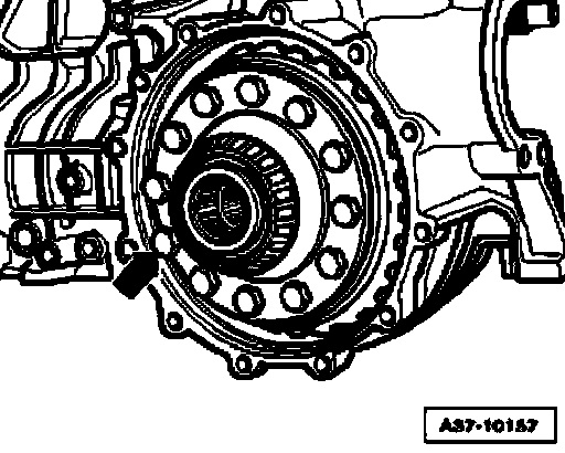 ^ When tightening bolts by hand, make sure the housing gap between intermediate flange for front final drive and transmission housing decreases evenly aft around.