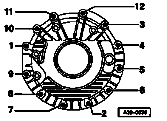 ^ Tighten bolts on front final drive cover in 2 stages in the tightening sequence shown as follows: