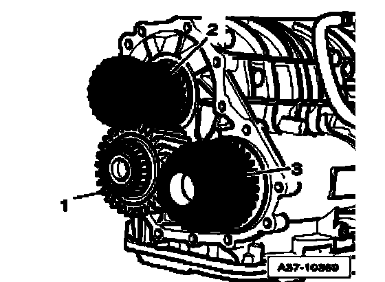 ^ Insert pinion gear - 3 - into transmission housing together with intermediate pinion - 1 -, as marked when removed, pull back drive pinion - 2 - from input shaft approximately 20 mm to do so.