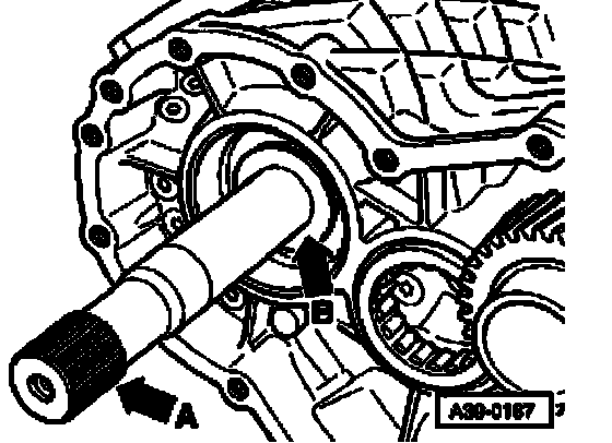^ Angled edge of axial needle bearing points toward adjustment shim (outer side of transmission).