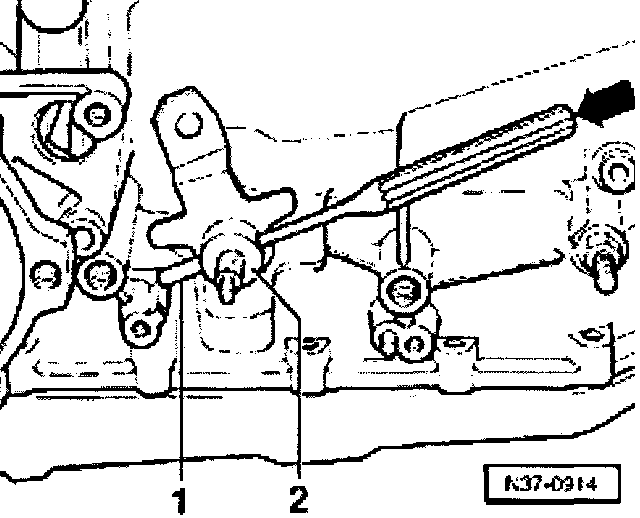 - Drive spring pin -1- out of transmission selector lever -2- -arrow- until transmission selector lever can be removed from selector shaft.