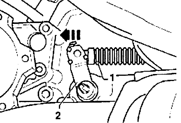 - Push selector lever cable -1- fully forward -arrow- and shift selector shaft lever -2- into position "2".