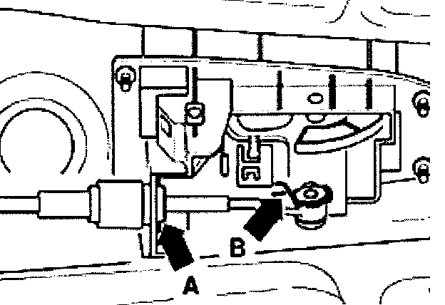 - Press together ends of securing clip -B- and slide onto end of selector lever cable.