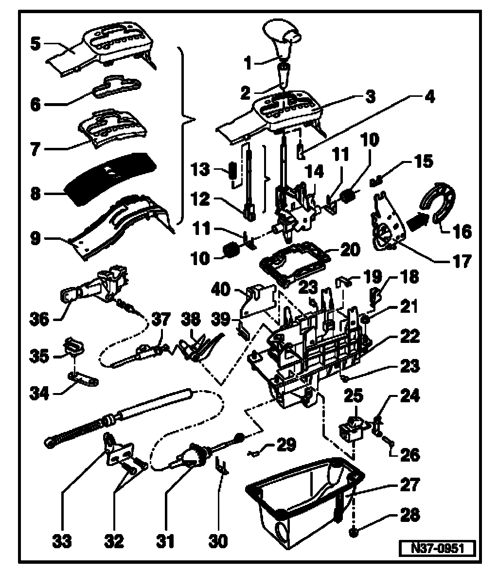 - Check locking function of locking cable lever -38-. It must engage in detent -16- and block selector lever with selector lever -14- in position "P".