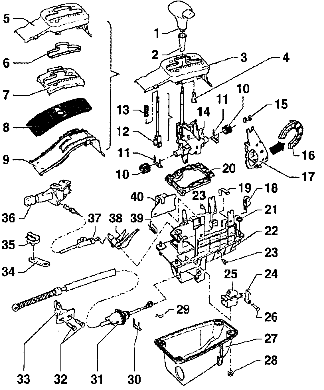- Remove complete selector lever 14-.