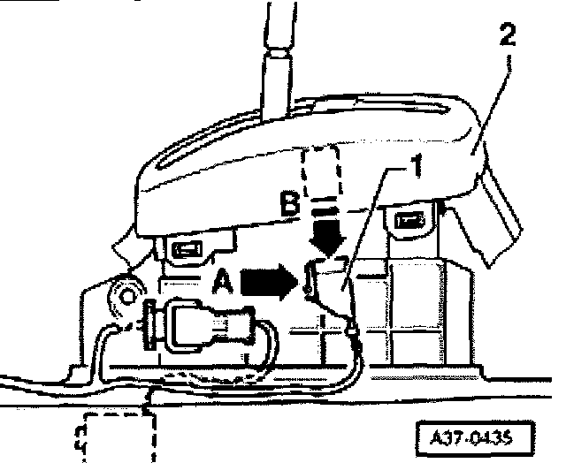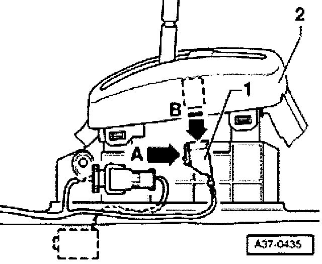 - Push connector-1- in opposite direction of arrow -B- in cover -2- before engaging in selector mechanism.