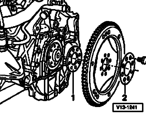 D - Incorrect installation position of drive plate for torque converter, drive plate secured to engine with incorrect shim - 1 - or shim - 1 - and washer - 2 - interchanged.