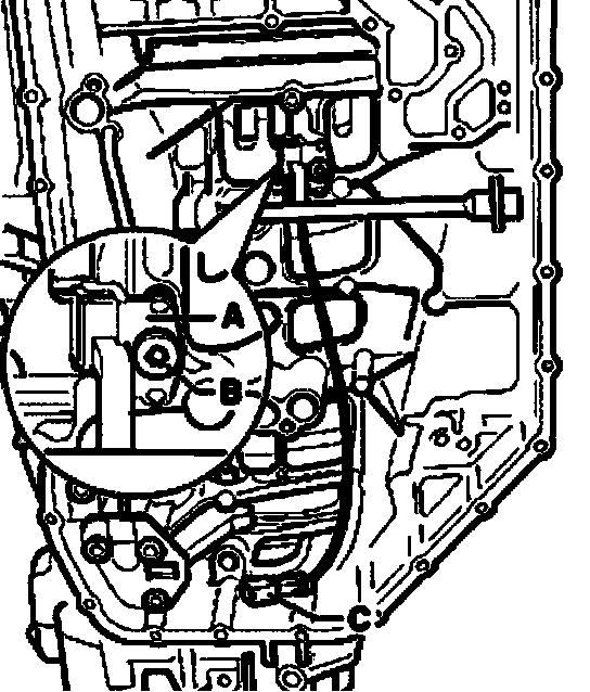 - Align dowel pin on valve body -arrow B- with hole in transmission housing -arrow C-.