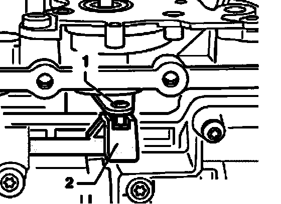 - Place valve body in position so that pin of detent plate -1- engages in slot on selector slide -2-.