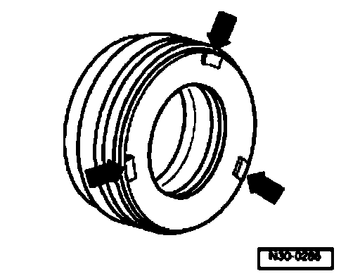 The three rectangular lugs (arrows) of the plastic ring engage in notches of the bearing race.